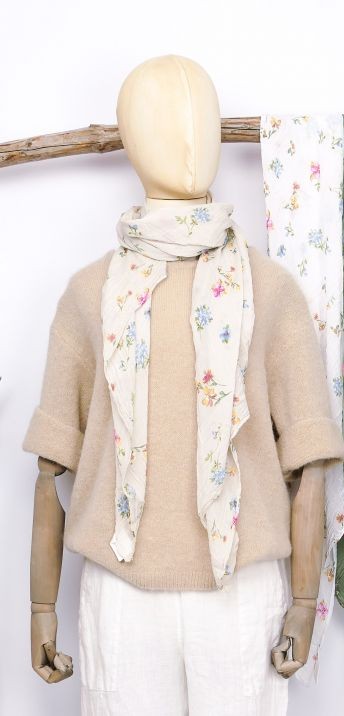 Der asymmetrische Schnitt verleiht dem Tuch eine moderne, lebendige Silhouette und macht es zu einem stilvollen Accessoire mit besonderem Charakter. Das florale Design erinnert an eine blühende Sommerwiese und bringt Frische sowie Leichtigkeit in jedes Outfit.